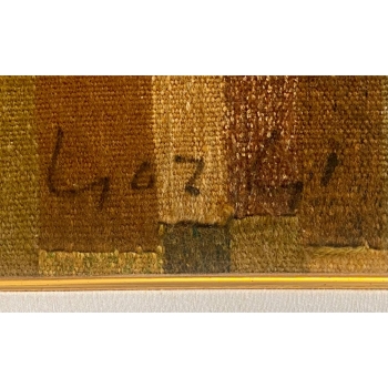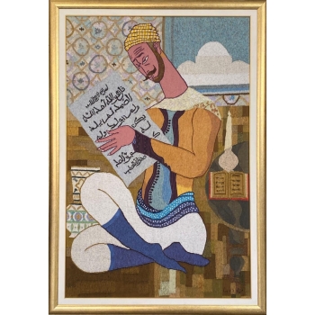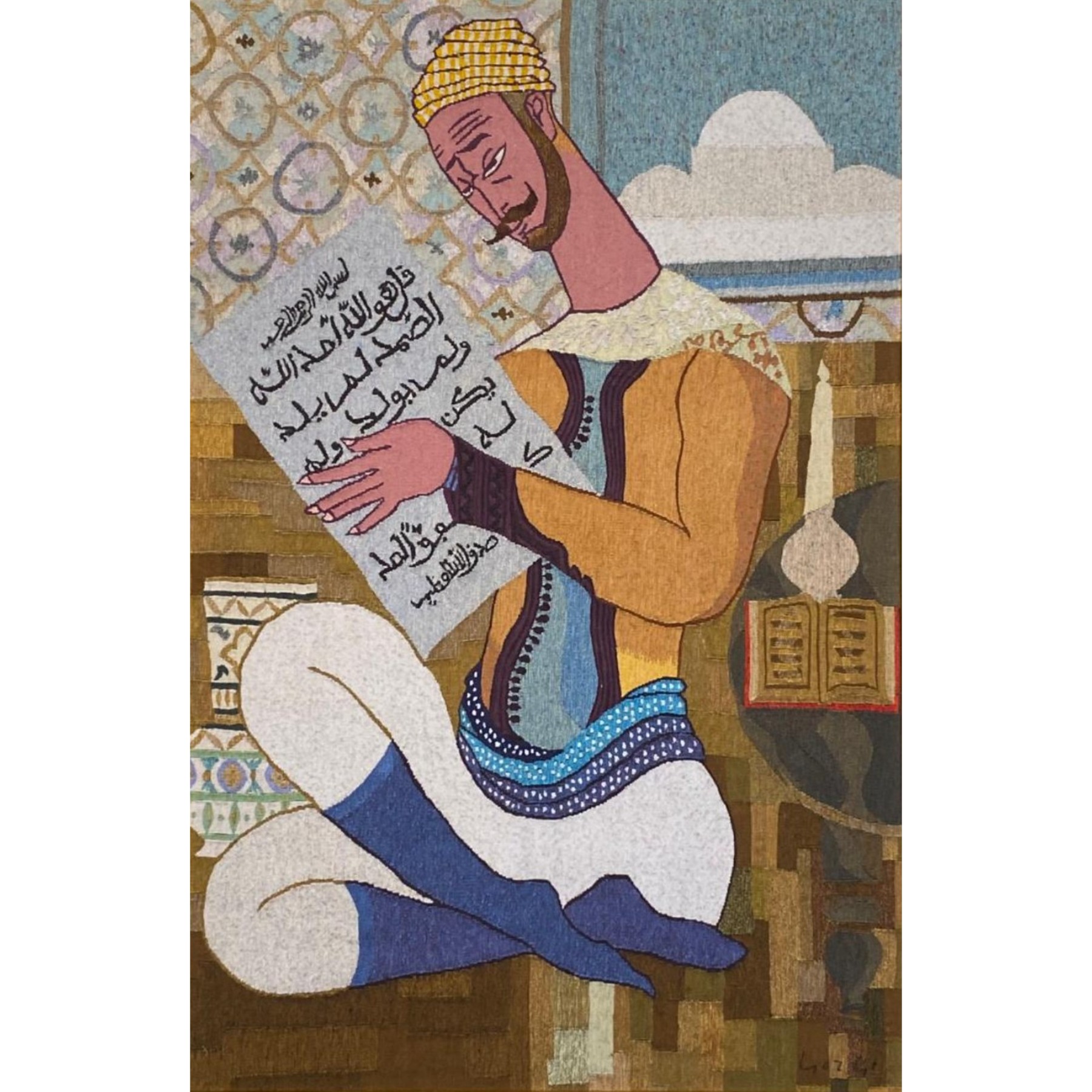 - Description: Une œuvre majeure d'Abdelaziz Gorgi Cette tapisserie, réalisée par le maître Abdelaziz Gorgi, est une pièce incontournable pour tout collectionneur d'art islamique ou de l'Ecole de Tunis. Le thème du lecteur du Coran, récurrent dans l'œuvre de Gorgi, est ici traité avec une sensibilité et une profondeur exceptionnelles. La calligraphie arabe, la richesse des couleurs et la finesse du travail témoignent du talent inégalé de l'artiste. Cette œuvre, datant des années 70-80, est un véritable témoignage de l'âge d'or de l'art tunisien. Elle sera un atout majeur pour toute collection. Abdelaziz GORGI (1928-2008) Le lecteur de coran Tapisserie laine fait main 150 x 100 cm