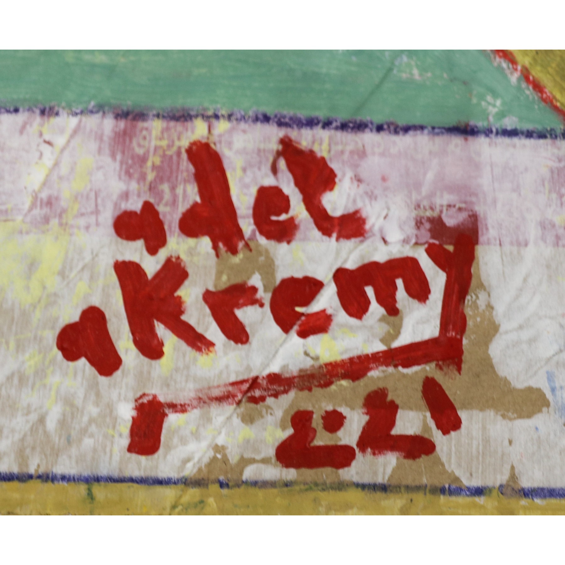 - Technique & support: Acrylique sur sac de ciment